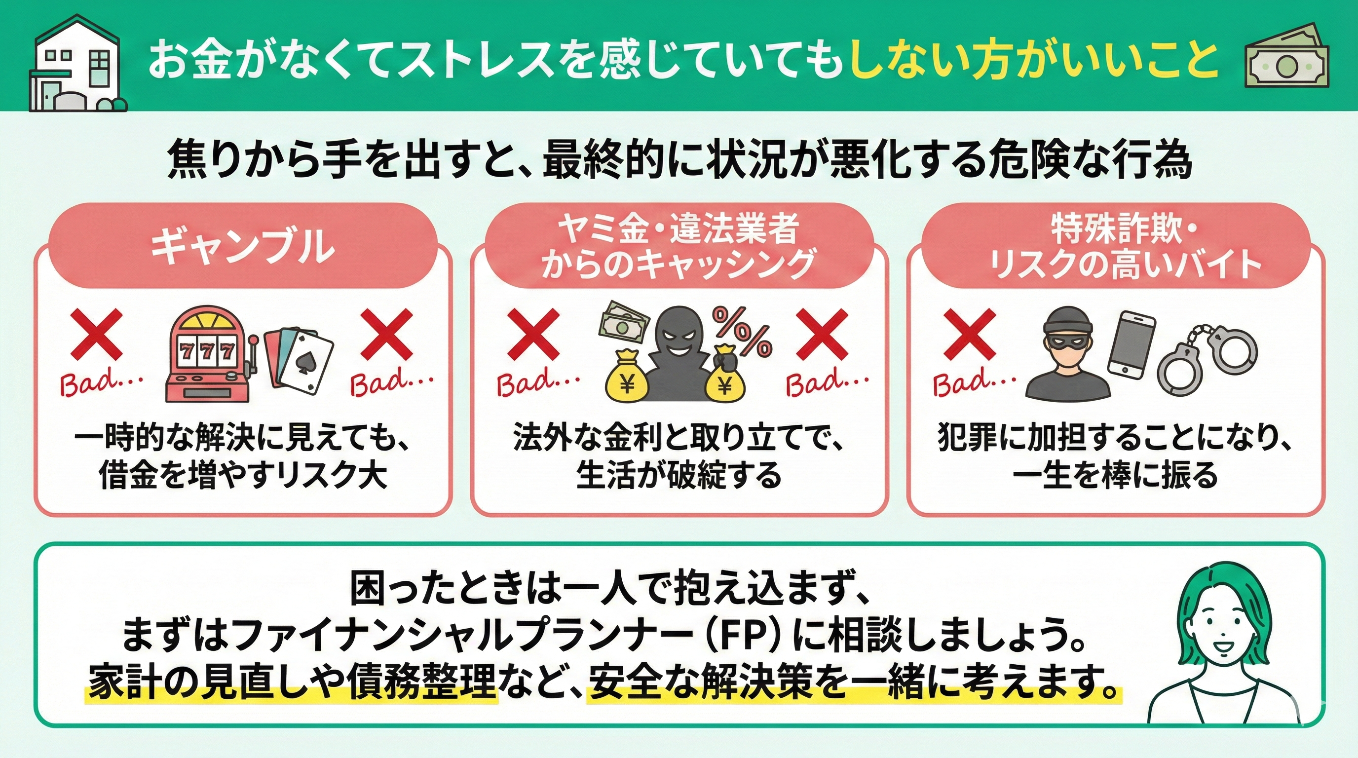 これから紹介する3つの行為は、一時的には問題を解決したように見えても、最終的には状況を大きく悪化させる可能性が高いので、手を染めず、困ったときはまずファイナンシャルプランナーに相談しましょう。