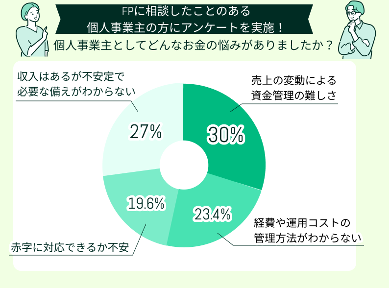 アンケートでは、多くの個人事業主が売上の変動による資金管理の難しさ、経費の把握不足、赤字への不安、収入の不安定さから将来が見通せないことなど共通した悩みを抱えていました。