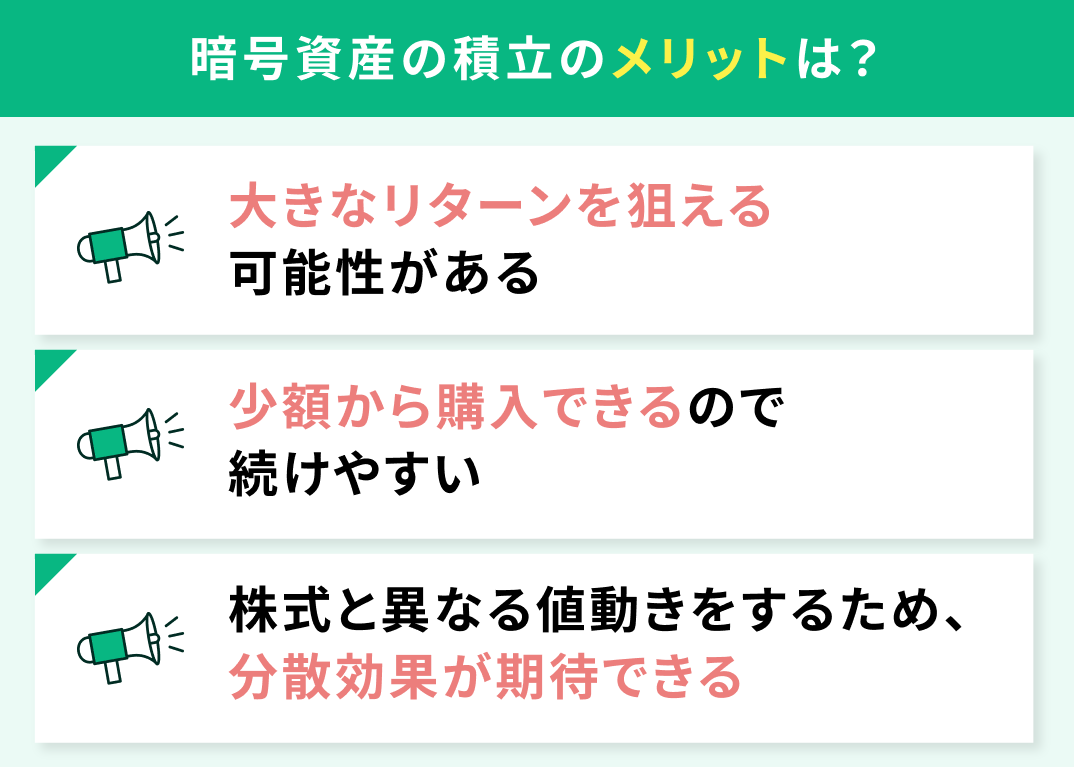 暗号資産の積立投資は、リスクを抑えつつ長期的な資産形成に取り組める方法です。さらに、主なメリットとして、この3つが挙げられます。