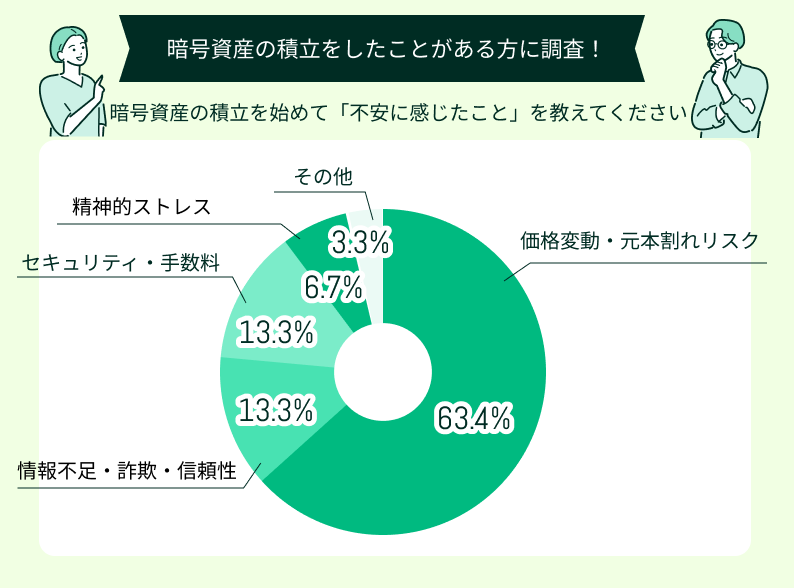 暗号資産の積立を始めて「不安に感じたこと」で多かったのは「価格変動・元本割れリスク」でした。暗号資産は価格の上下が激しいため、運用中に資産価値が大きく変動する点に多くの人が不安を抱いています。