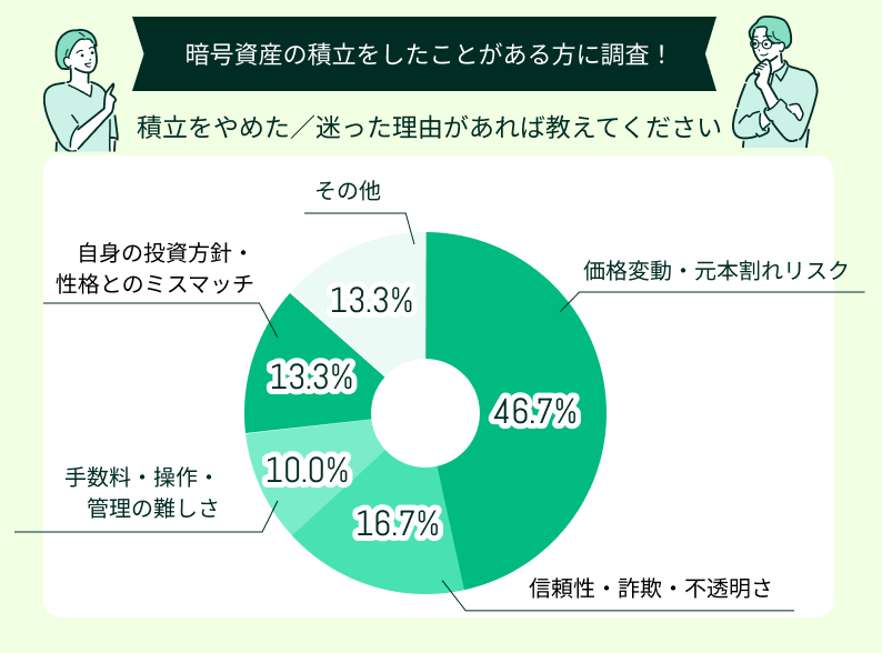 暗号資産の積立をやめた・迷った理由として多かったのは「価格変動・元本割れリスク」でした。暗号資産特有の値動きの激しさに不安を感じ、継続に慎重になる人が多いことがわかります。