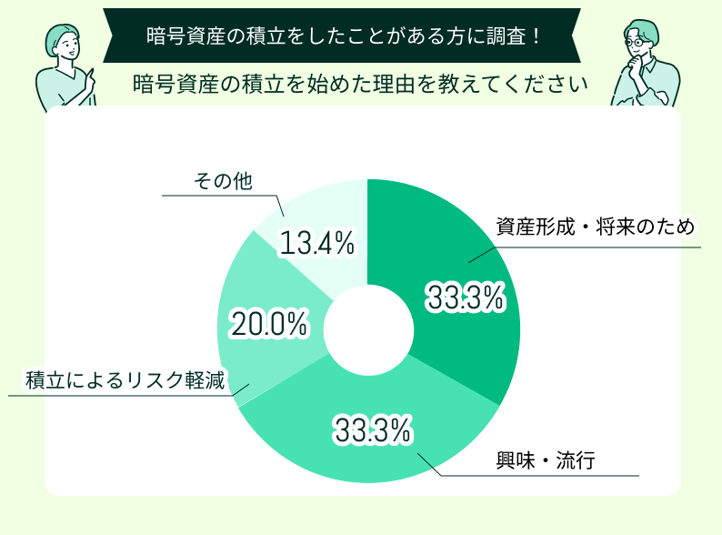 暗号資産の積立を始めた理由として多かったのは「資産形成・将来のため」と「興味・流行」がともに33.3%で、いずれも3人に1人が回答しています。