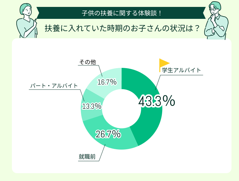 扶養に入れていた時期、子供は「学生アルバイト」だったという方が約半数の43.3%を占めました。