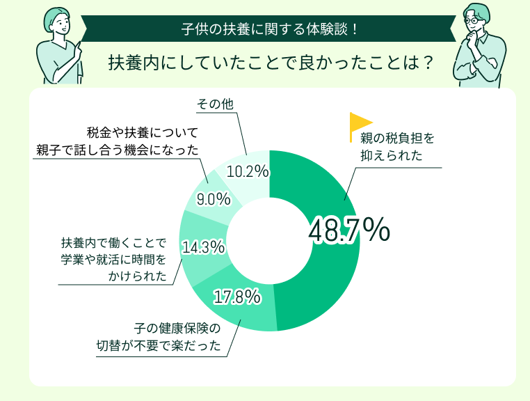 扶養内にしていたことで良かった点で最も多かったのは「親の税負担を抑えられた」(48.7%)でした。