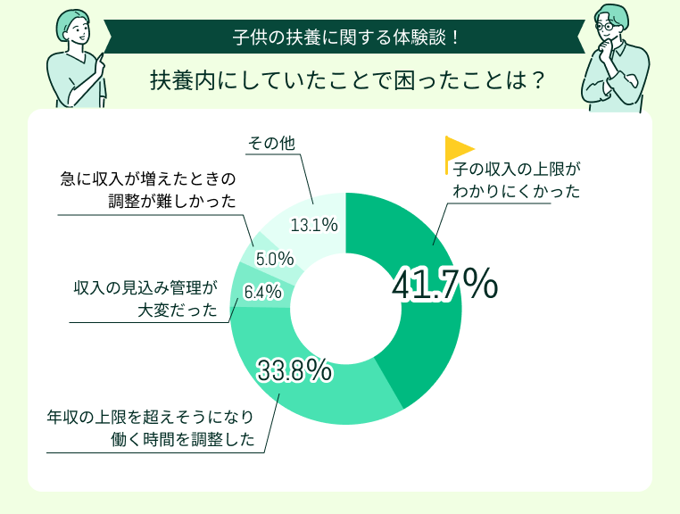 扶養内にしていたことで困った点で多かったのは「子の収入の上限がわかりにくかった」(41.7%)、「年収の上限を超えそうになり働く時間を調整した」(33.8%)でした。