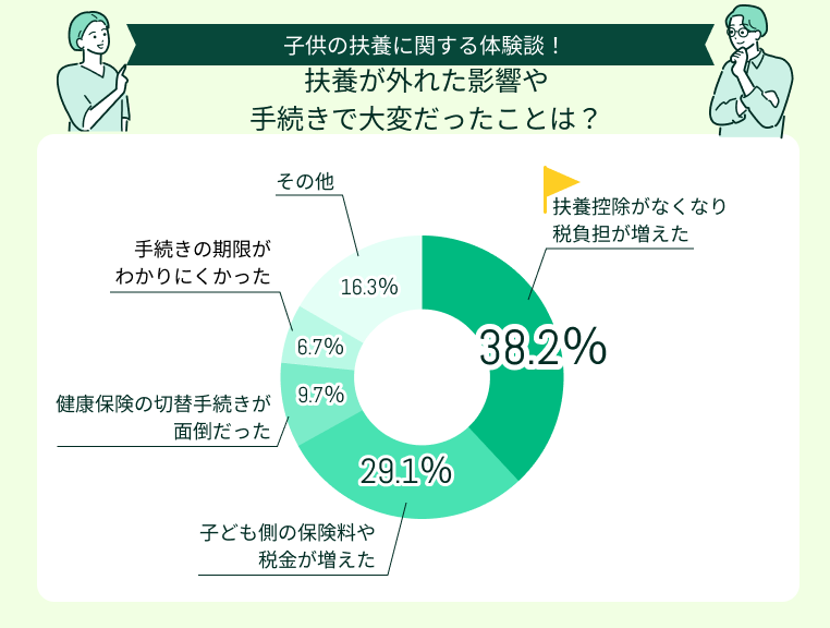 子供が扶養から外れた影響や手続きで大変だったことで多かったのは「扶養控除がなくなり税負担が増えた」(38.2%)、「子ども側の保険料や税金が増えた」(29.1%)でした。