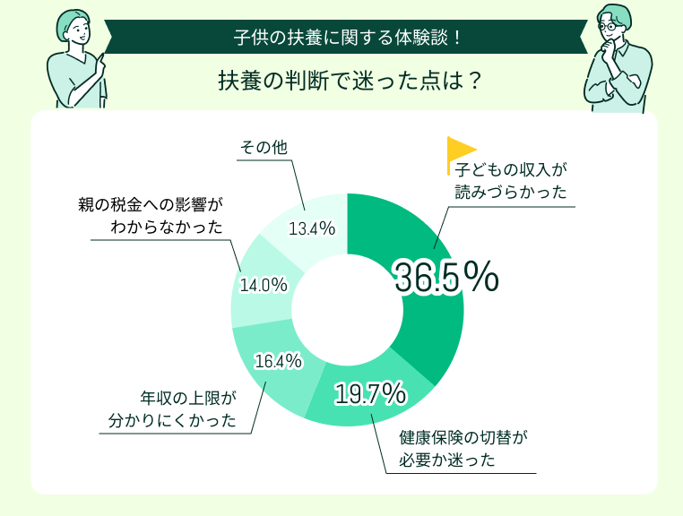 子供を扶養に入れるか・外すかの判断で迷った点で多かったのは「子どもの収入が読みづらかった」(36.5%)。
