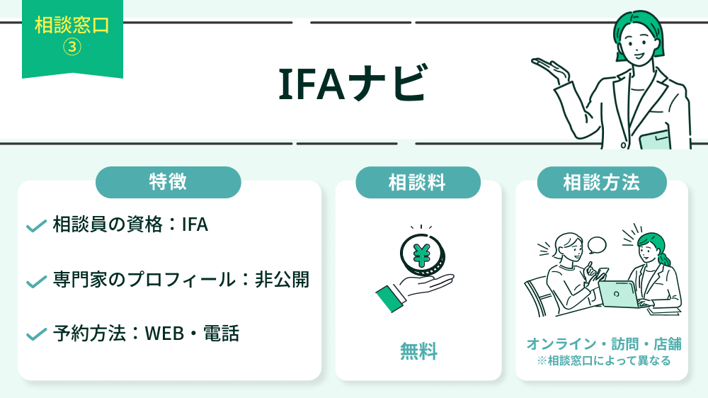 IFAナビは、あなたの相談したい内容に合わせて、ぴったりのIFAを無料で紹介してくれるサービスです。 一般的なFP相談よりも投資・運用についてより専門的な相談ができます。