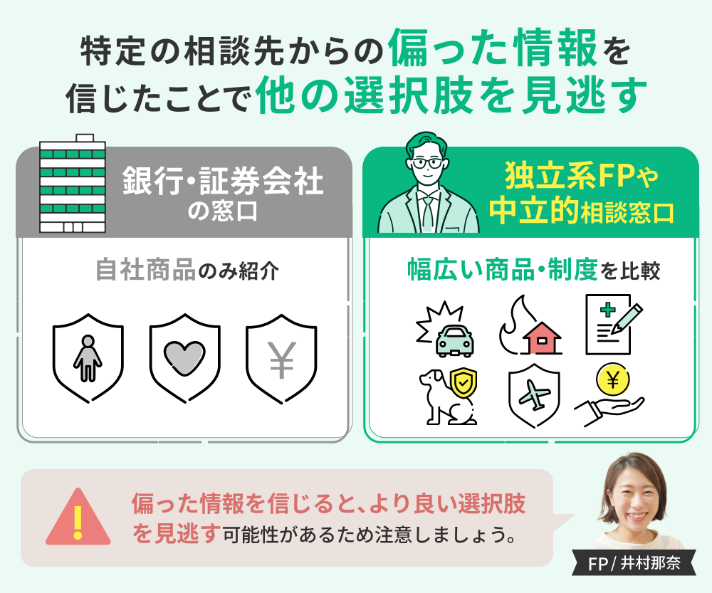 銀行や証券会社の窓口担当者は、いわば「自社製品の販売員」です。どうしても販売手数料などの自社の利益が優先され、あなたにとって最適とは限らない商品を提案されるリスクが拭えません。