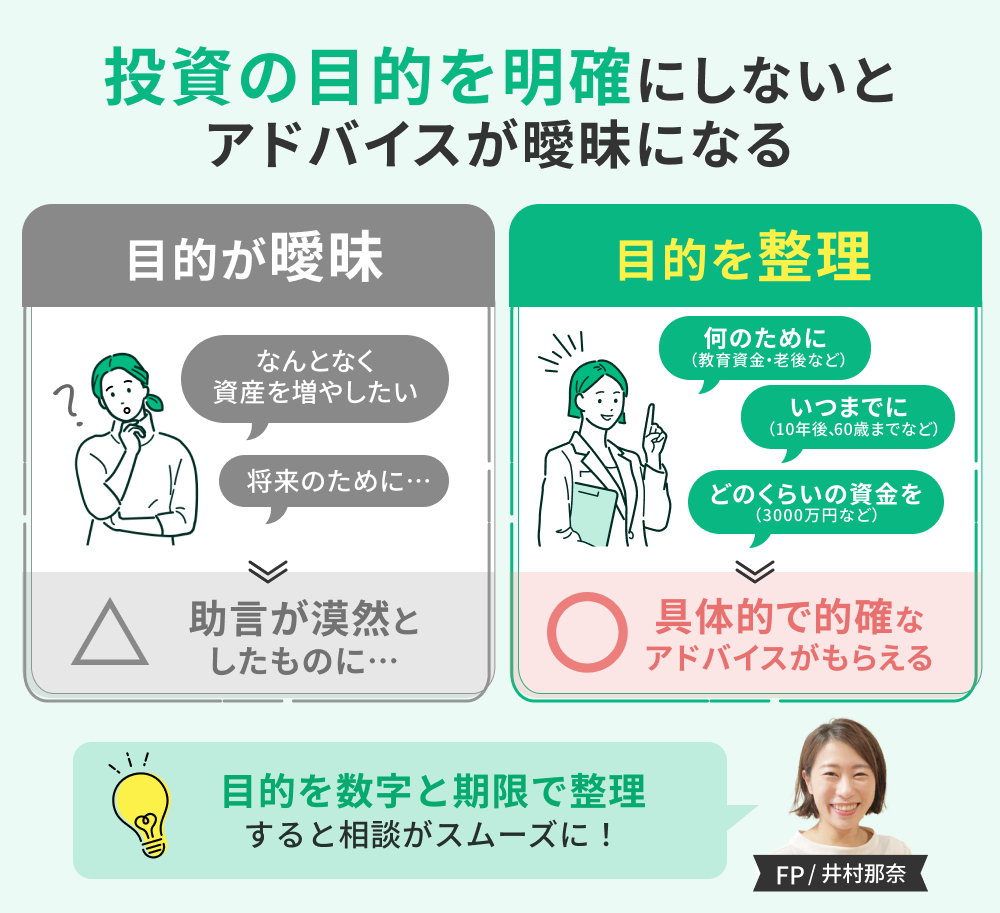 投資の目的が曖昧なまま相談を始めてしまうと、返ってくるアドバイスも一般的な教科書通りの内容に留まってしまい適切なアドバイスが得られないケースがあります。