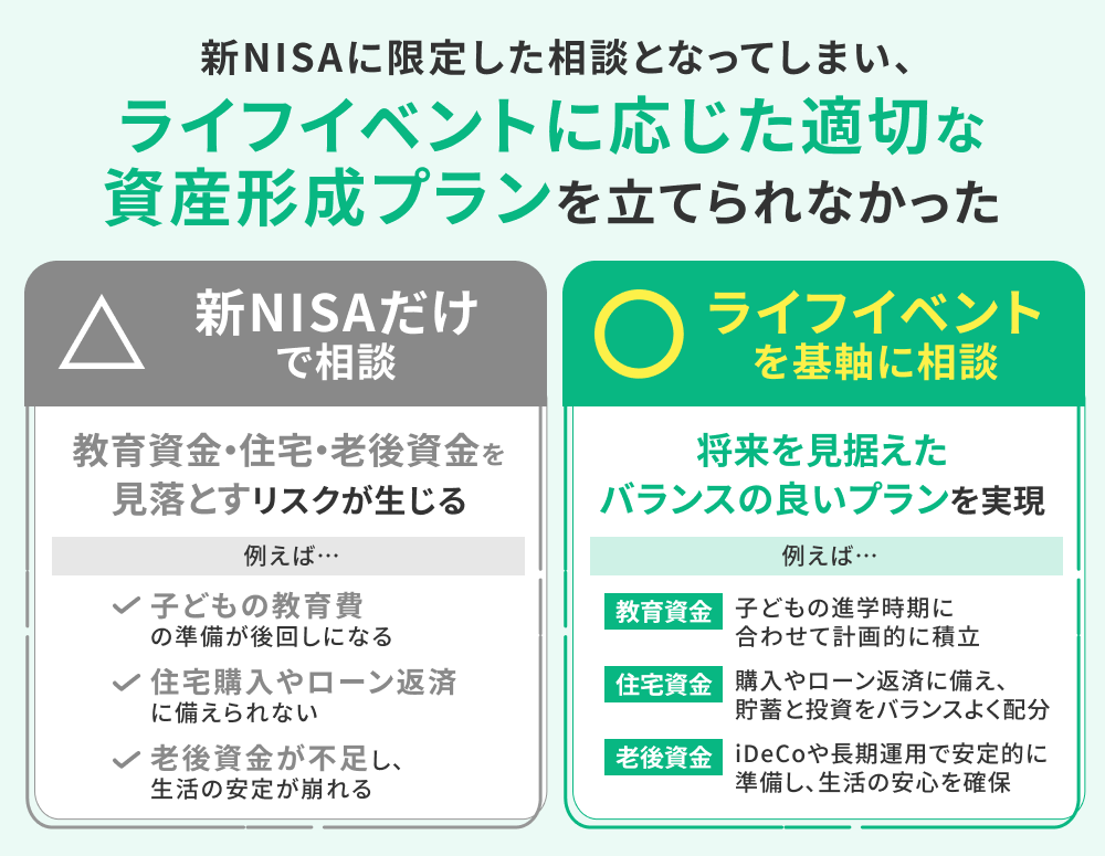 自分一人では判断が難しい「万が一のための生活防衛資金」の具体的な金額と、余剰資金を新NISAで運用するオーダーメイドの長期設計を提示されたことで、夫婦揃って納得感を持ってスタートを切れたといいます。