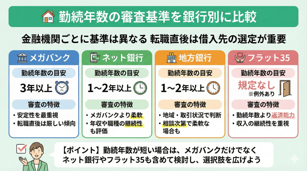 | フラット35 | 規定なし(例外あり) | 勤続年数より収入の継続性と返済能力を重視 |