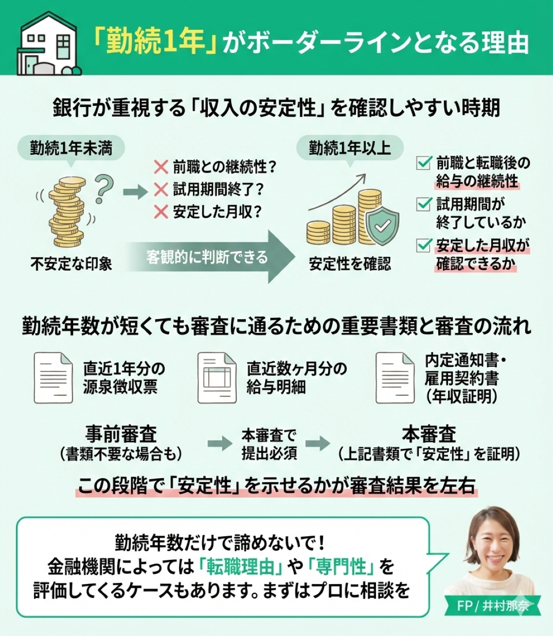 多くの金融機関で「勤続1年」が一つのボーダーラインとされる理由は、銀行側が重視する収入の安定性を客観的に確認しやすくなる時期だからです。