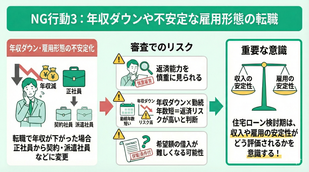 転職に伴い前職より年収が減少した場合や、正社員から契約社員・派遣社員へと雇用形態が変化した際は、住宅ローンの審査において返済能力をより厳格に評価される傾向にあります。