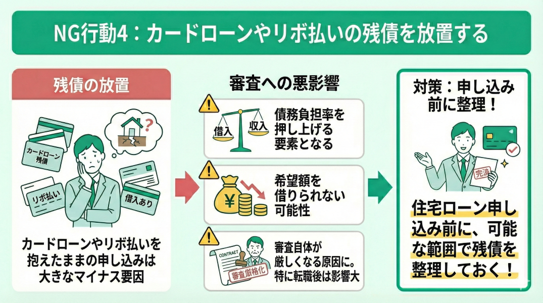 ここでは、実際に審査落ちやトラブルにつながりやすい代表的なNG行動を4つご紹介します。