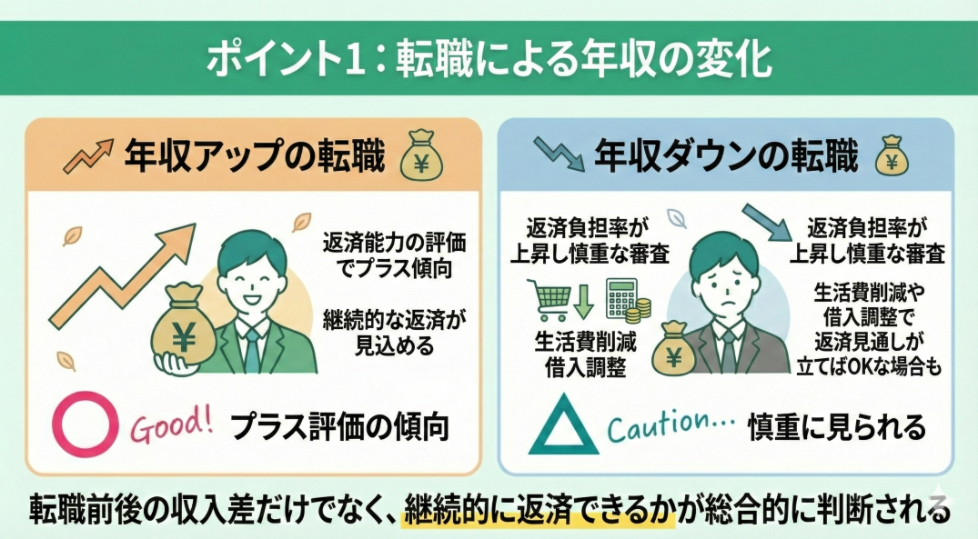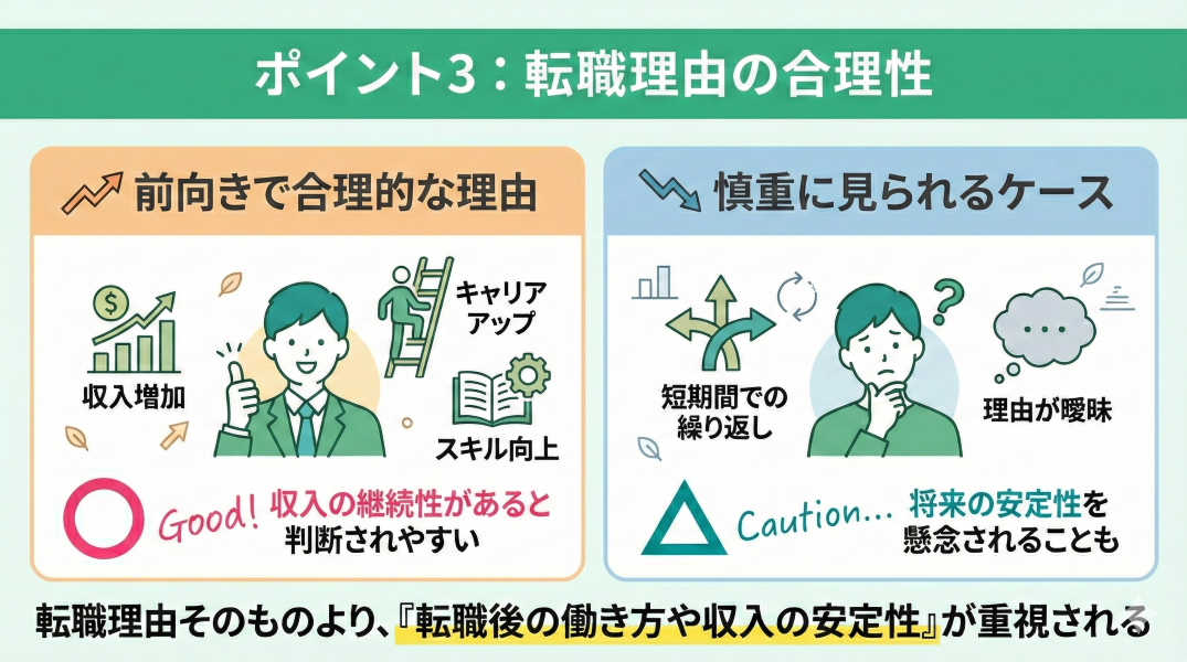 スキルアップや大幅な年収増を目的とした前向きなキャリアチェンジであれば、金融機関からは「将来にわたる返済の継続性が高い」と肯定的に評価される傾向にあります。