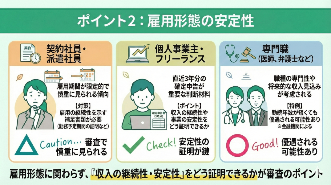 金融機関が最も重視する「収入の安定性」を客観的に判断するための材料が不足しがちなのが実情です。