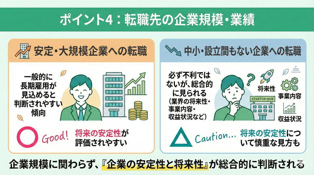 一般論として、資本金や従業員数が多い大企業や、業績が長年安定している企業であれば、長期にわたる雇用と収入の継続性が見込めると評価されやすくなります。