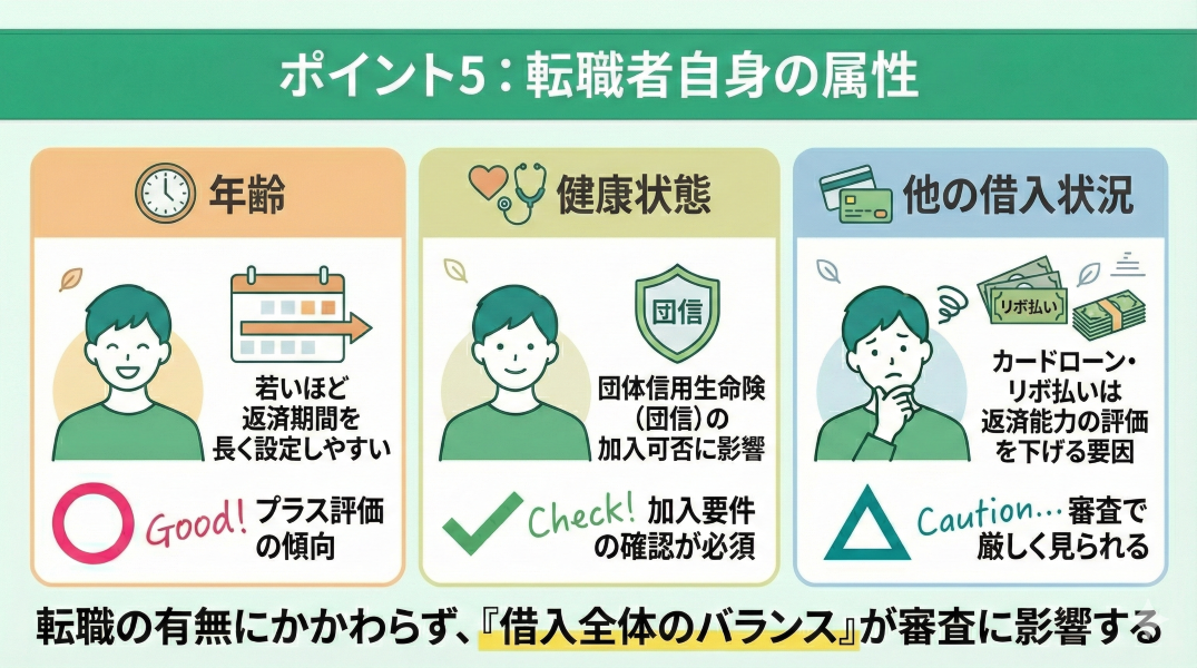 転職の事実に加え、申込者本人の基礎的な「属性」が融資の可否や条件を左右する重要な判断材料となります。
