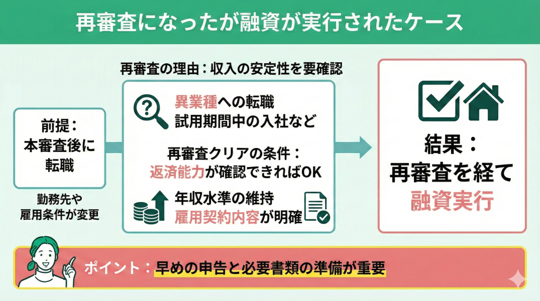もっとも、年収水準が前職と同等以上に維持されており、かつ雇用契約の内容も明確であるなど、実質的な返済能力に問題がないと判断されれば、再審査を経て無事に融資が実行されることもあります。