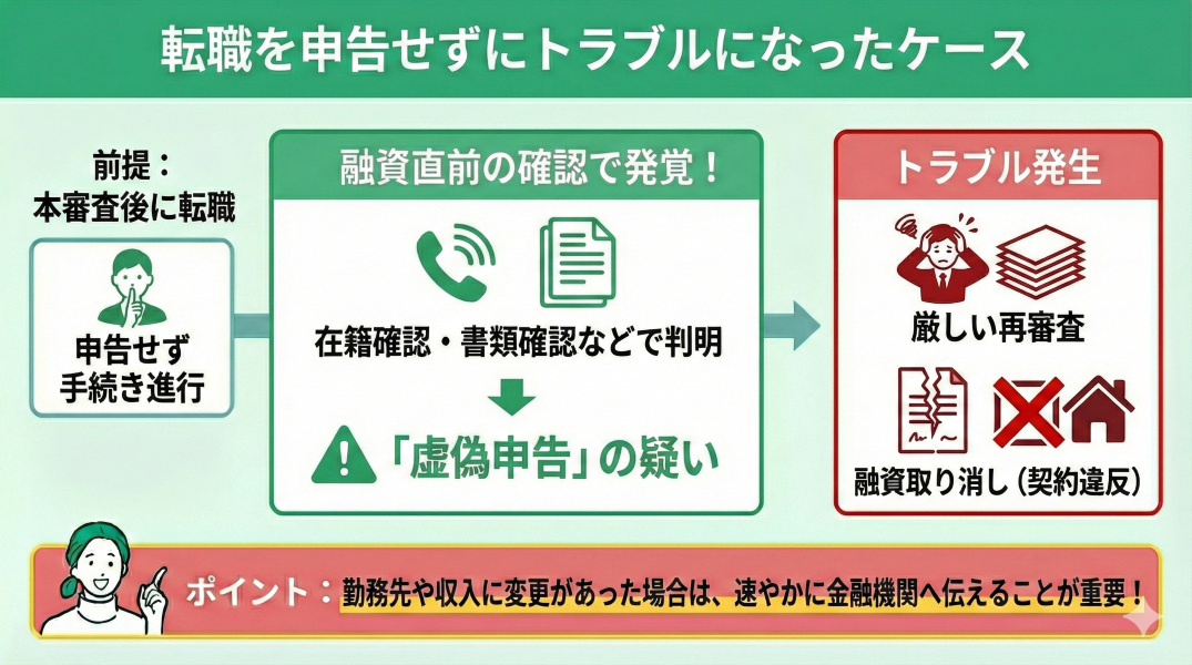 本審査通過後に転職した事実を金融機関に隠したまま手続きを強行し、最終段階で取り返しのつかないトラブルに発展してしまうケースが散見されます。