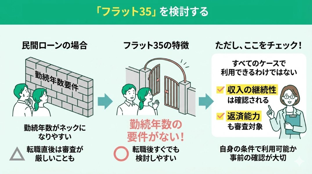 一般的な民間ローンとは異なり、フラット35には勤続年数に関する一律の要件が設定されていないため、転職後間もない方でも審査の土台に乗ることが可能です。