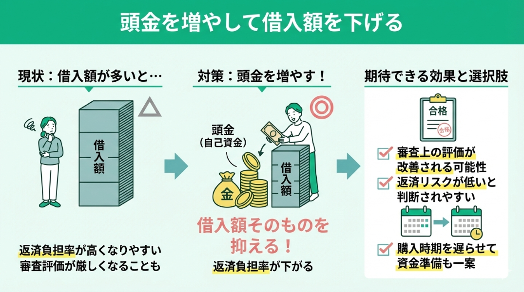 自己資金(頭金)を多めに用意して借入金額そのものを抑えることも、審査のハードルを下げるためには非常に有効な手段の一つです。