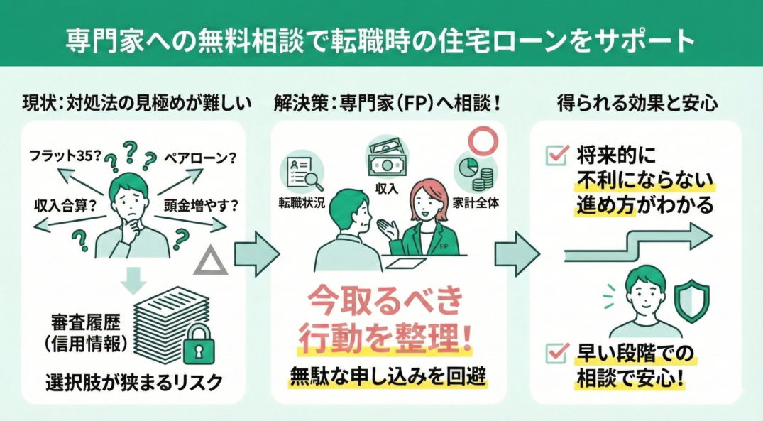 住宅ローンに精通したFP(ファイナンシャルプランナー)に相談すれば、転職後の年収や家計の収支を踏まえたうえで、今取るべき具体的な行動を整理できます。