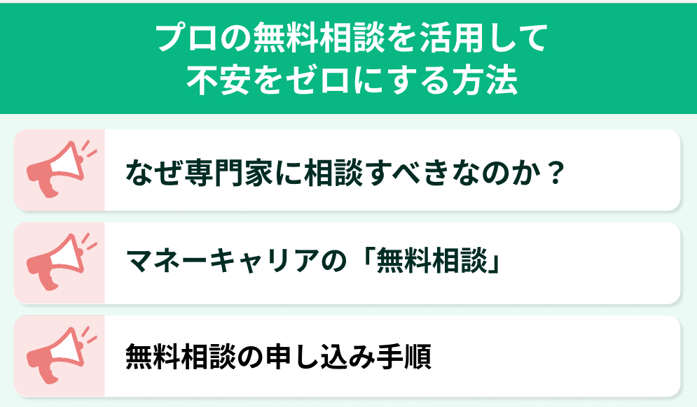 - マネーキャリアの「無料相談」で解消できる不安の具体例