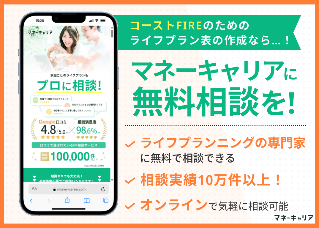 - コーストFIREを達成し、安全に維持し続けるためには、まずFPに無料相談してライフプラン表を作成することが重要。