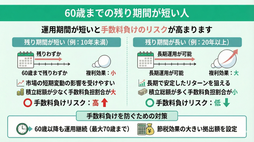 60歳までの残り期間が短い人は、iDeCoで手数料負けしやすいリスクが高まります。