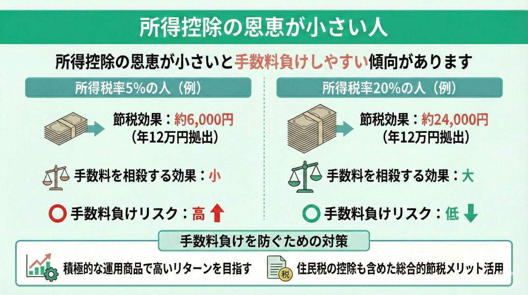 所得控除の恩恵が小さい人は、iDeCoで手数料負けしやすい傾向があります。