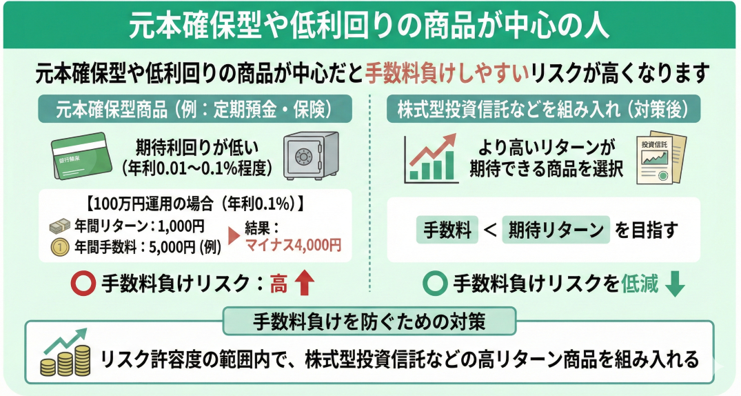 元本確保型や低利回りの商品が中心の人は、iDeCoで手数料負けしやすいリスクが高くなります。