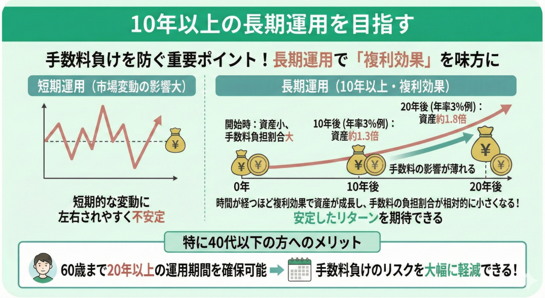 iDeCoで手数料負けを防ぐためには、10年以上の長期運用を目指すことが重要です。
