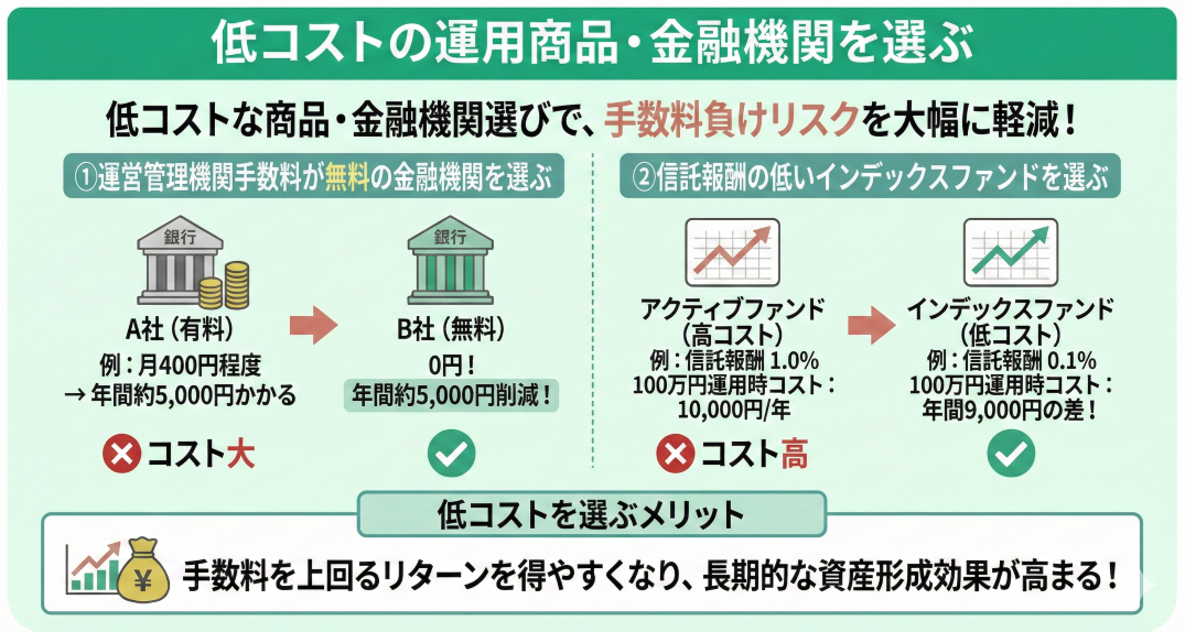 低コストの運用商品・金融機関を選ぶことで、手数料負けのリスクを大幅に軽減できます。