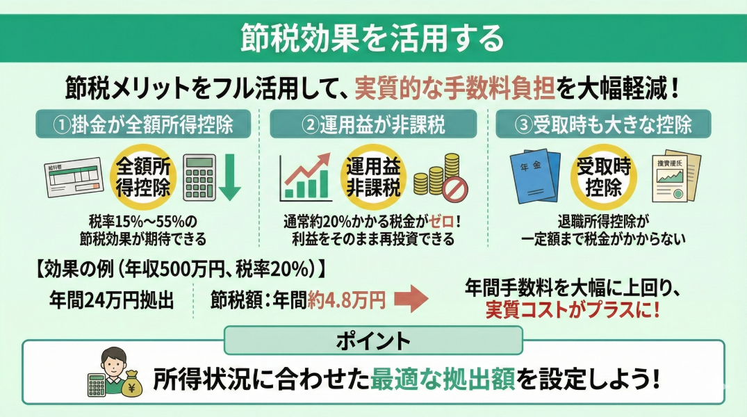 例えば、年間24万円拠出して税率20%の場合、約4.8万円の節税効果があり、これだけで年間手数料を大幅に上回ります。