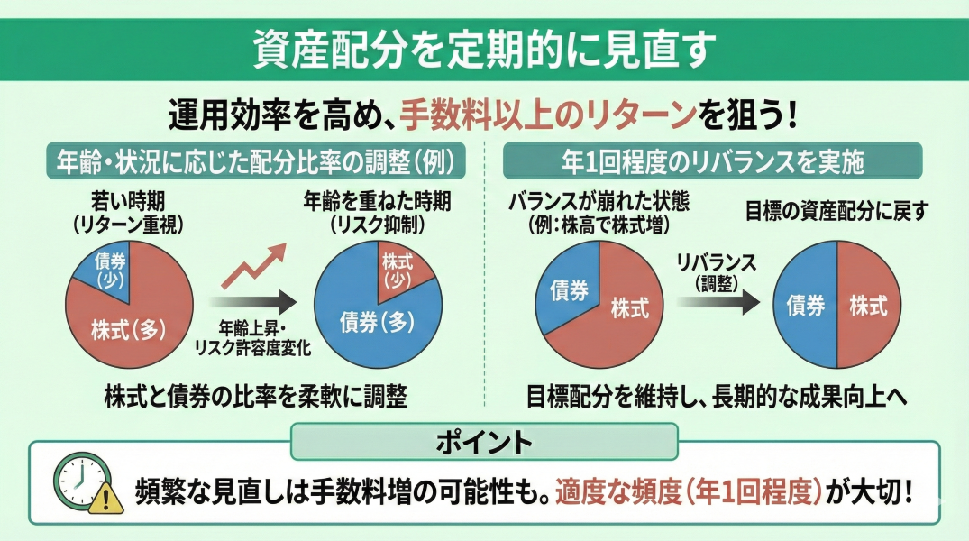 資産配分を定期的に見直すことで、iDeCoの運用効率を高め、手数料以上のリターンを得やすくなります。