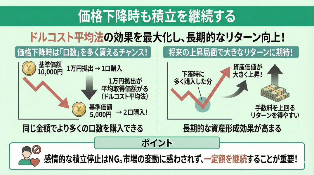 価格下降時も積立を継続することで、ドルコスト平均法の効果を最大化し、長期的なリターン向上が期待できます。