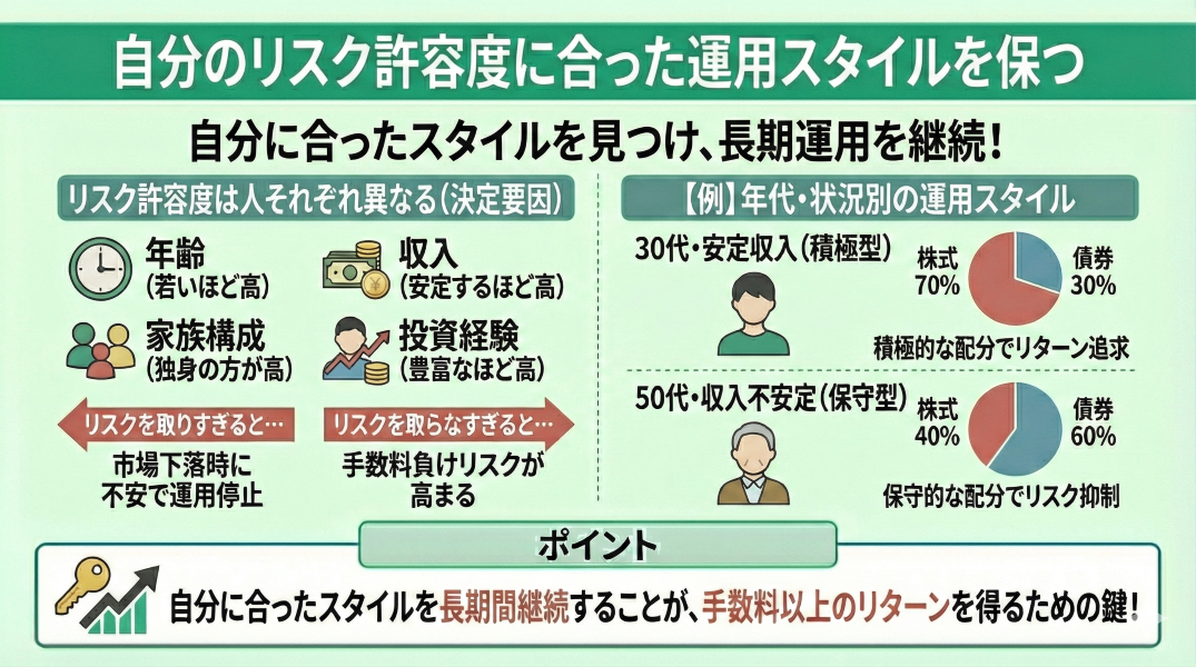 自分のリスク許容度に合った運用スタイルを保つことで、精神的な負担を軽減し、長期的な運用を継続できます。