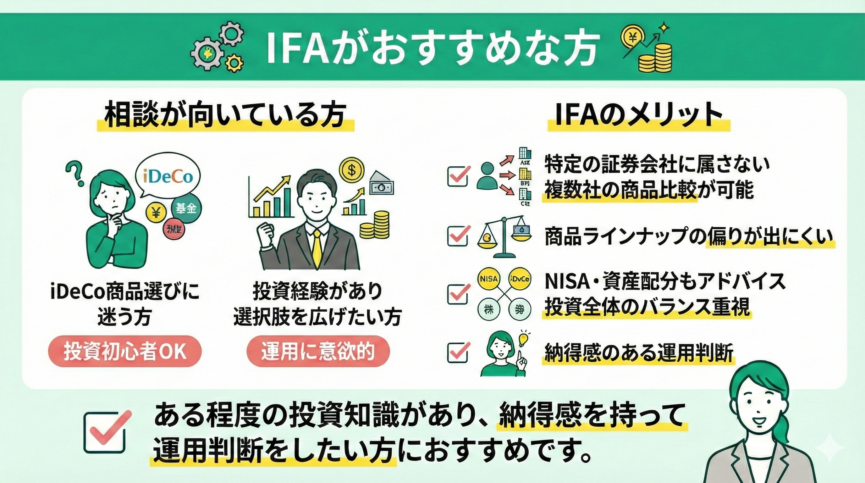 iDeCoでどの商品を選ぶべきか迷っている方や、すでに投資経験があり運用の選択肢を広げたい方には、IFAへの相談が向いています。