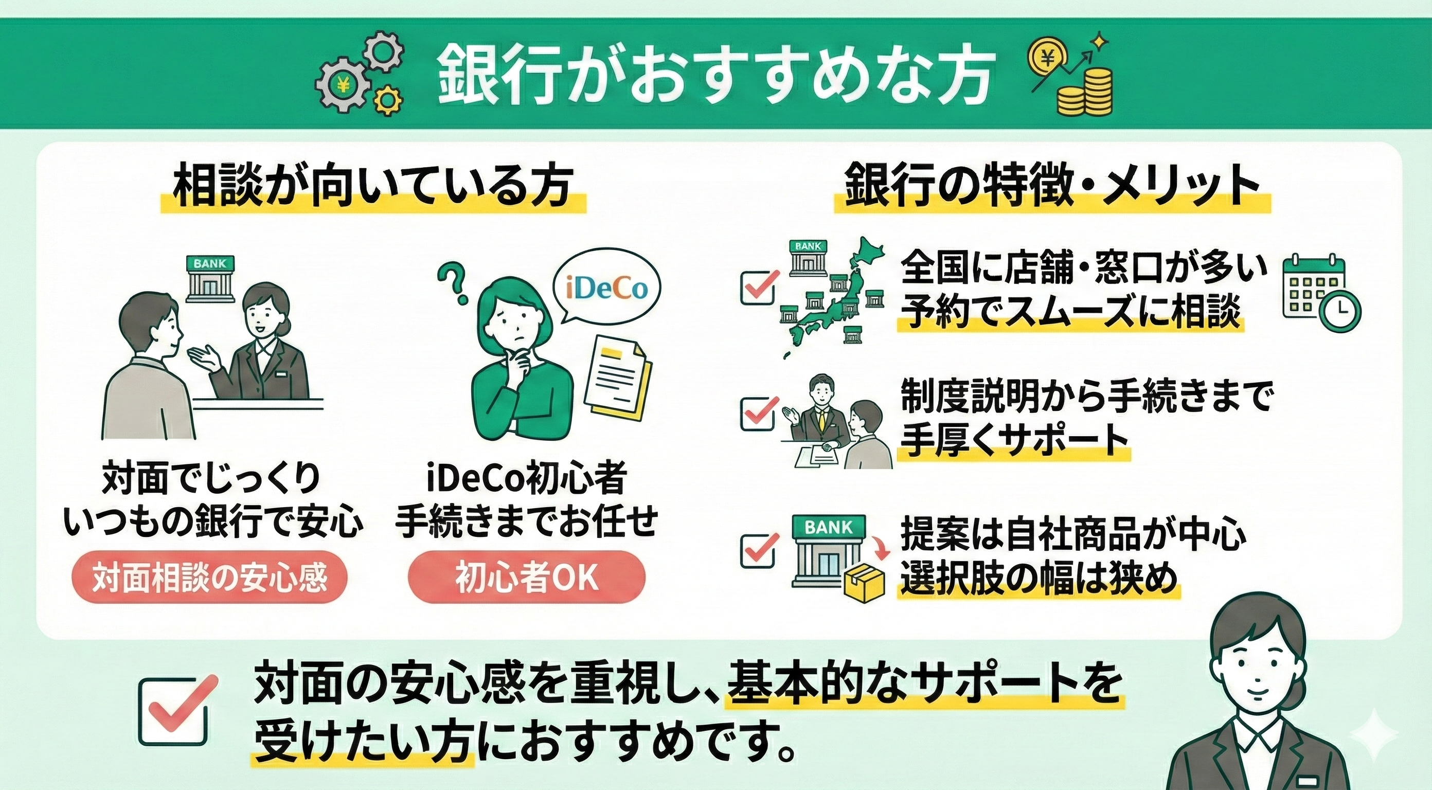 一方で、提案内容は自社商品が中心になりやすいため、選択肢の幅を重視したい方は注意が必要です。まずは気軽に話を聞きたい、対面相談の安心感を大切にしたいという方には、銀行は有力な相談先といえます。