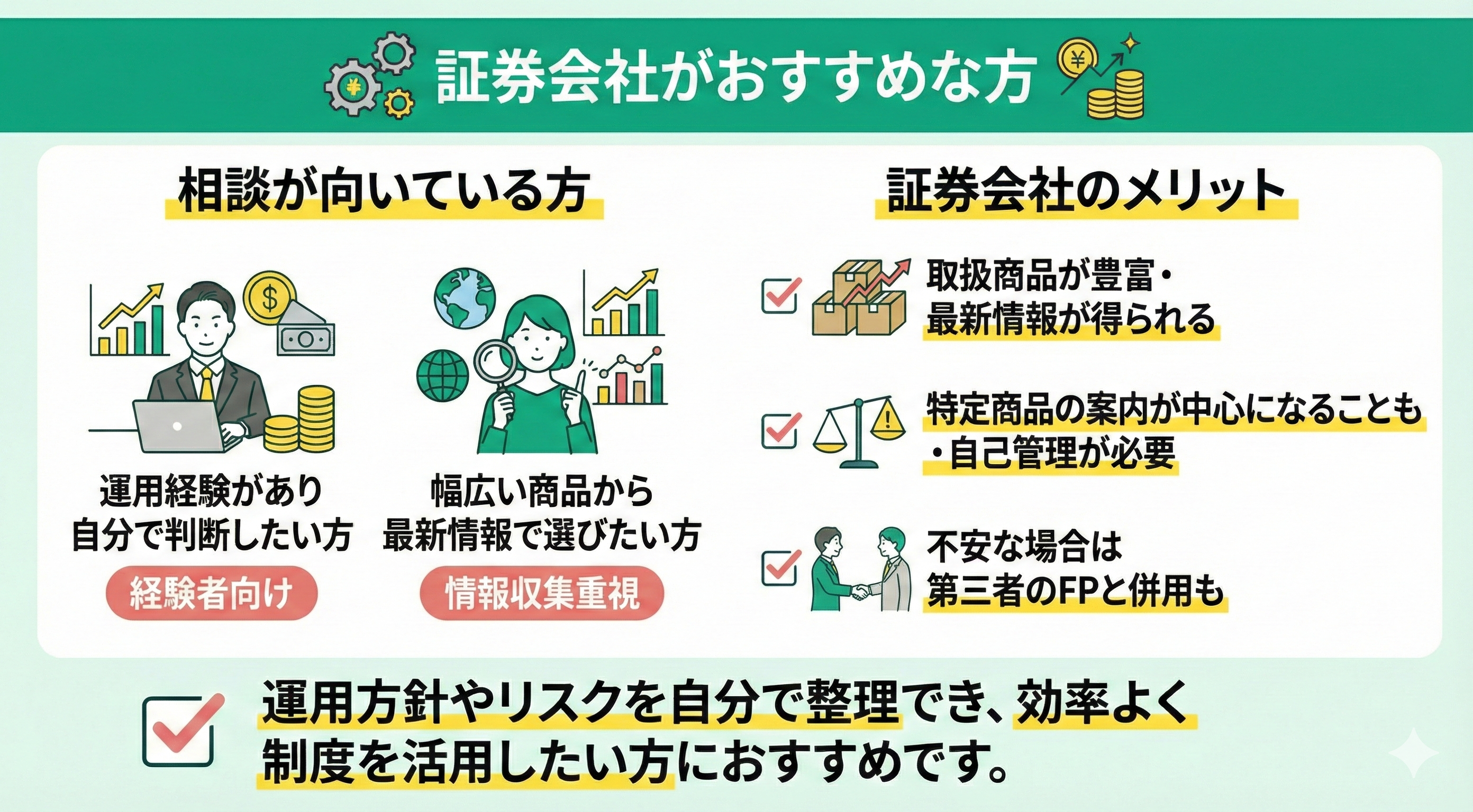 すでに株式や投資信託の運用経験があり、iDeCoでも自分で商品を比較・判断したい方には、証券会社が向いています。
