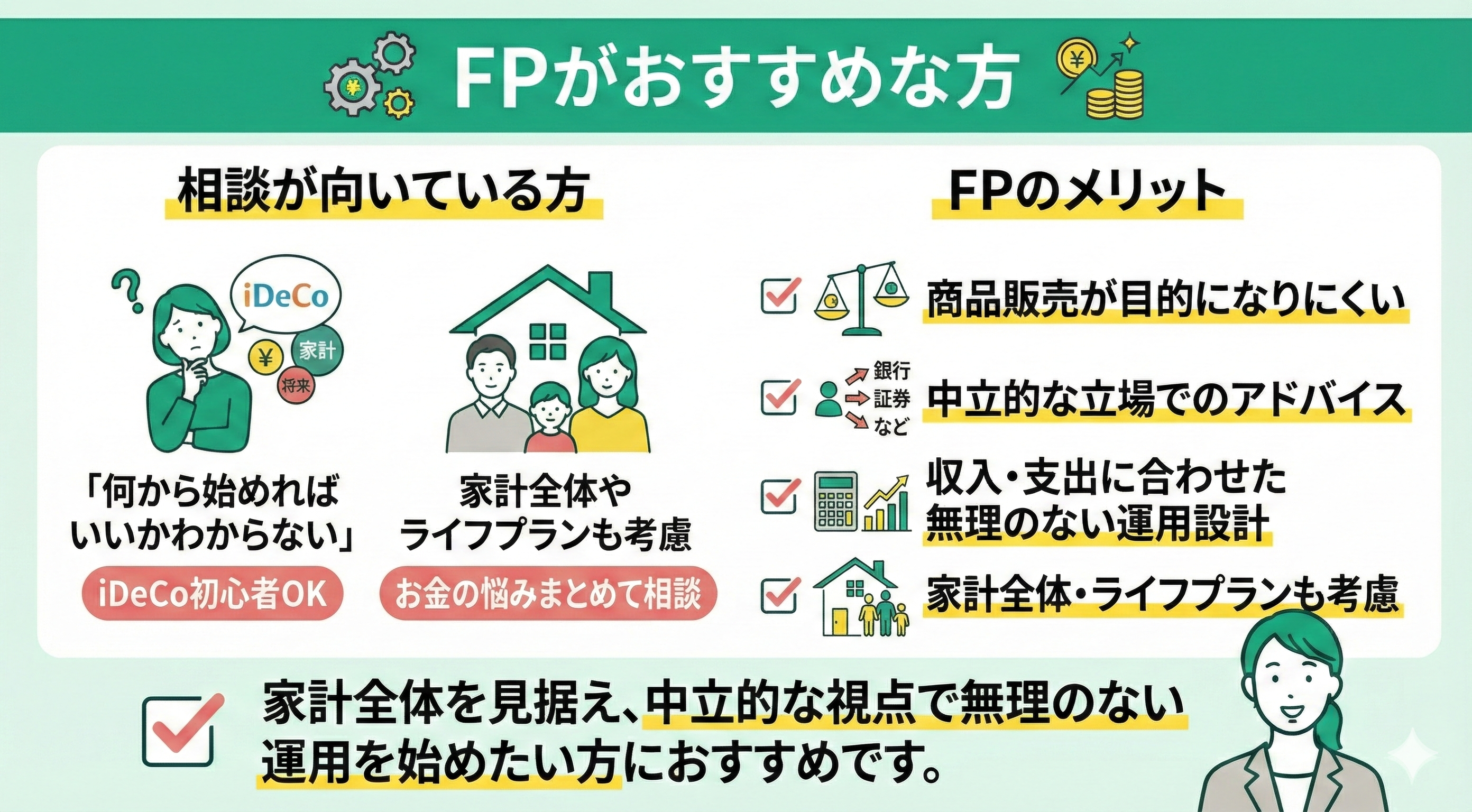 iDeCoの相談先には、IFA・FP・銀行・証券会社といった選択肢がありますが、それぞれ得意分野や提案スタンスが異なります。中でもFPは、iDeCoだけでなく家計全体や将来のライフプランまで見据えて助言できるのが特長です。