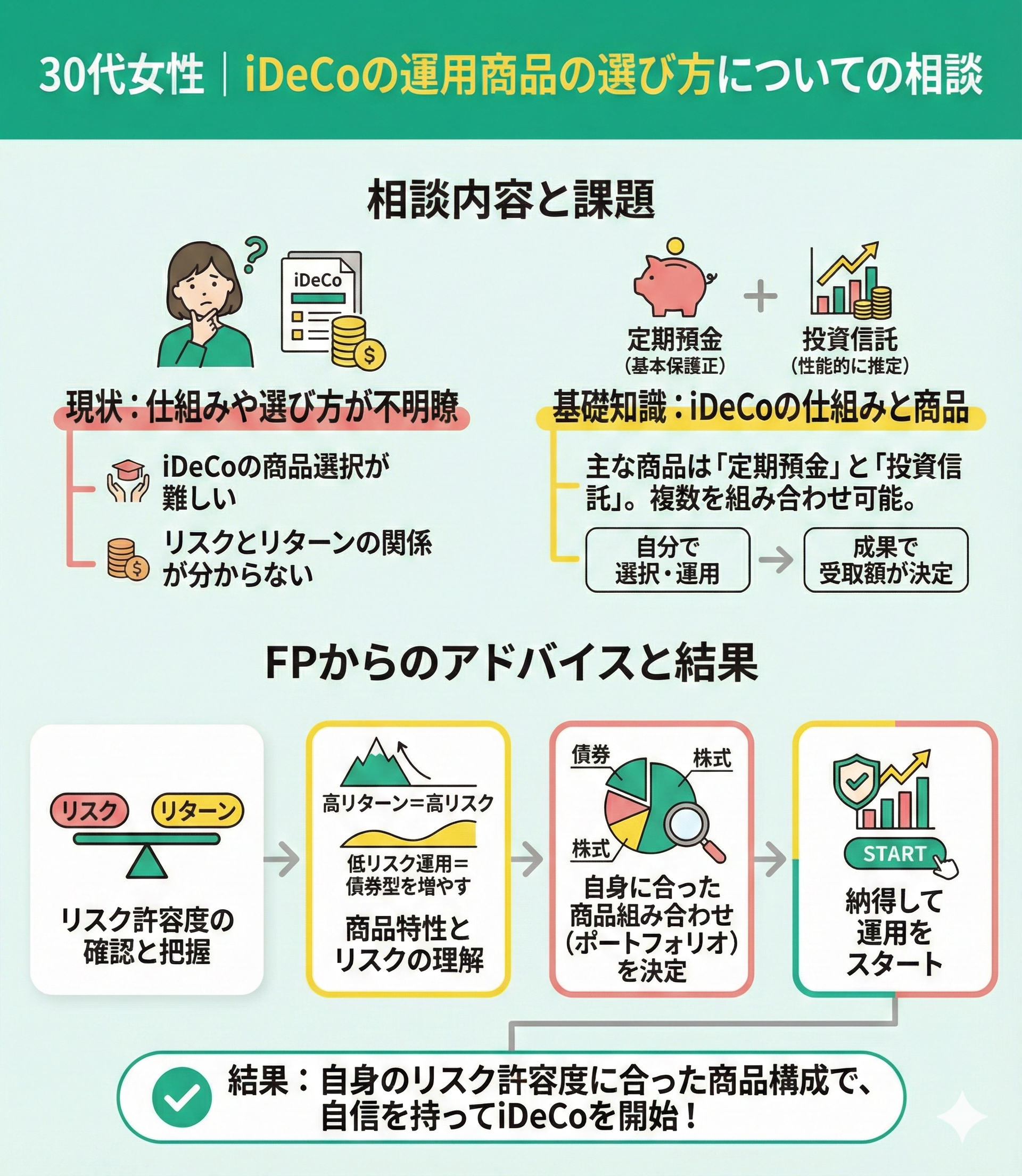 30代女性は運用商品の仕組みや選び方がわかりにくいと感じ、相談窓口を利用した結果、自身のリスク許容度に合った商品選定のアドバイスを受けることができました。