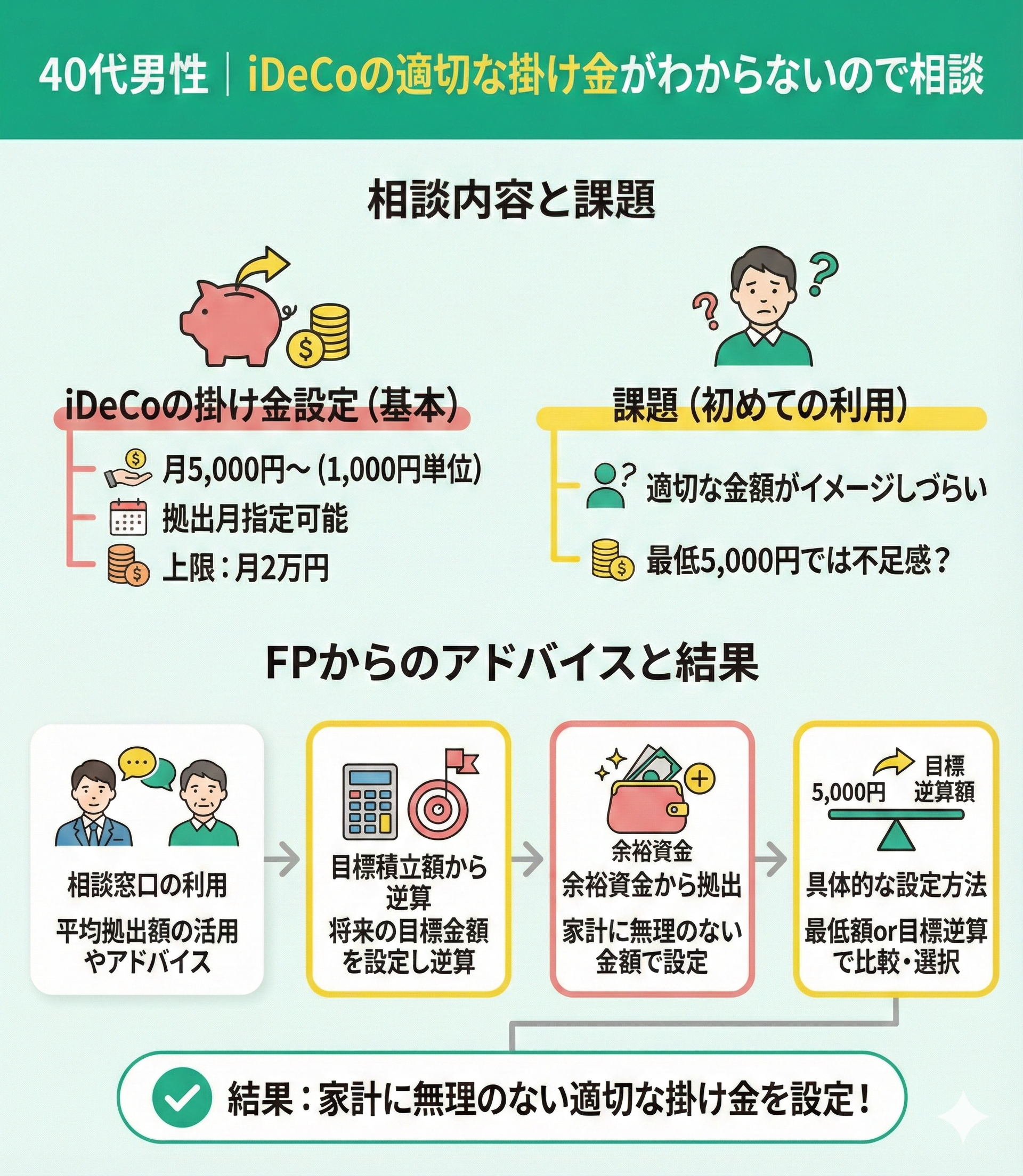 40代男性は適切な掛け金を知るため相談窓口を利用し、平均拠出額の活用や目標積立額から逆算する方法をアドバイスされたことで、家計に無理のない金額を設定できました。