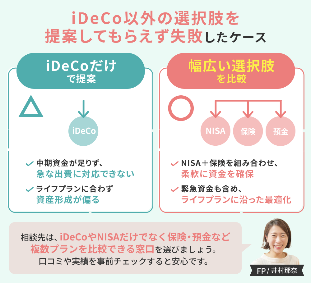iDeCoの運用相談をしたものの、他の資産形成プランを提案してもらえなかった失敗例もあります。iDeCoは長期運用と節税には有効ですが、中期資金の確保には不向きです。