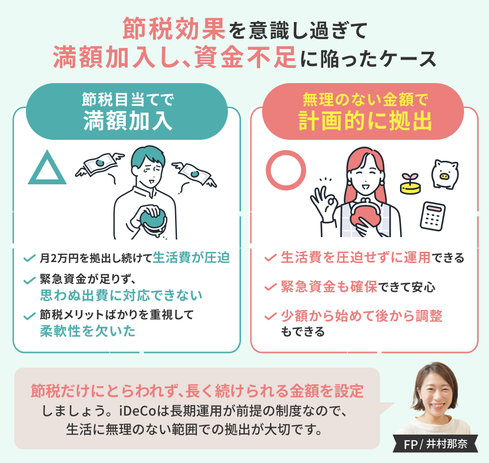 - 節税効果を意識し過ぎて満額加入してしまい資金不足に陥ってしまう