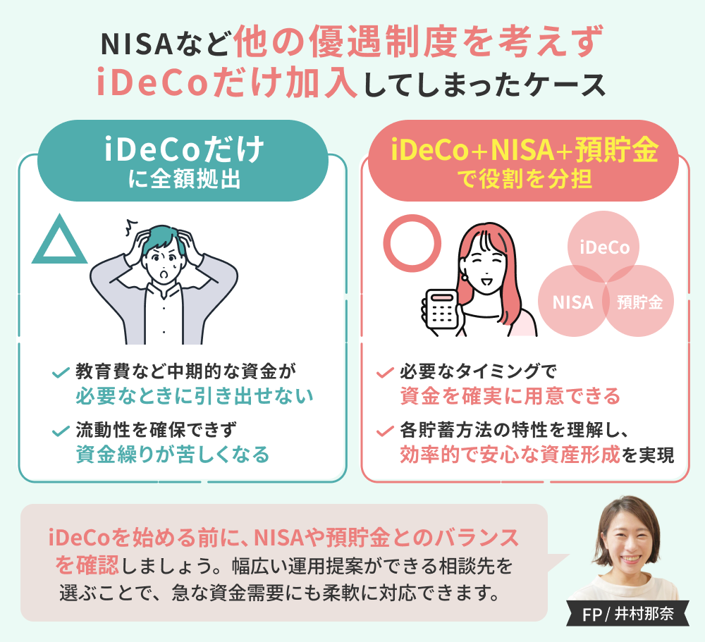 iDeCoを検討する際は、NISAや預貯金で一定の流動性を確保しておくことが重要です。