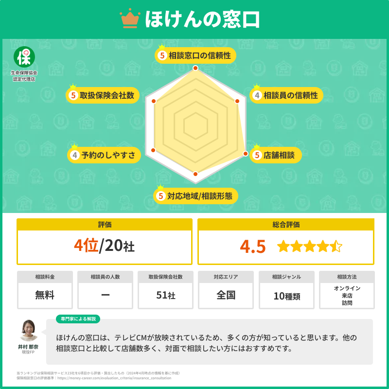 「ほけんの窓口」は、生命保険や損害保険など、40社以上の保険会社から300を超える商品を取り扱っています。幅広い選択肢の中から、相談者一人ひとりのニーズに合わせたプランを提案してもらえるのが特徴です。