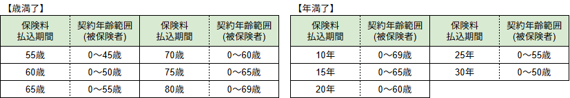保険料払込期間 | 保険料払込期間は、年齢または年数で設定できます。 |